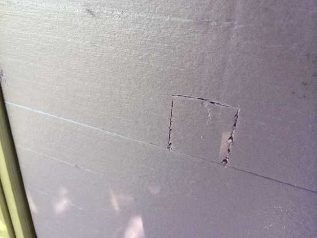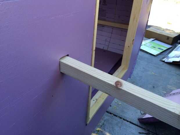 También hice unos pequeños agujeros (con el cuchillo caliente!) en las paredes a través del cual se deslice adicional 61" 2 x 2"travesaños de s para una estructura de estante. (Foto) Usé tres travesaños en total dos para la base (alrededor de 21" de alto de piso-espacio para mi tamaño de 12 en una cama de aire de 6") y una viga transversal vertical 18" mayor para construir un muro de frente de cubby/el estante de almacenamiento.