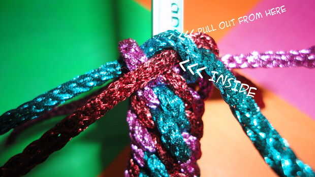 Enganche el extremo inferior del cordón derecho en sentido horario alrededor de la cuerda arqueada siguiente e inserte a través del centro del nudo de corona (ver imagen).