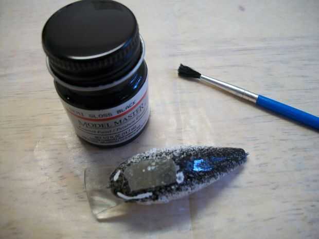 Usé grano 220 y 400. Había unas cuantas burbujas en mi epoxy después de que había fijado. Utilicé un alambre pequeño y algo de agua para quitar el polvo de lijado. La pintura negra que usa hizo un buen trabajo de llenado de las burbujas.