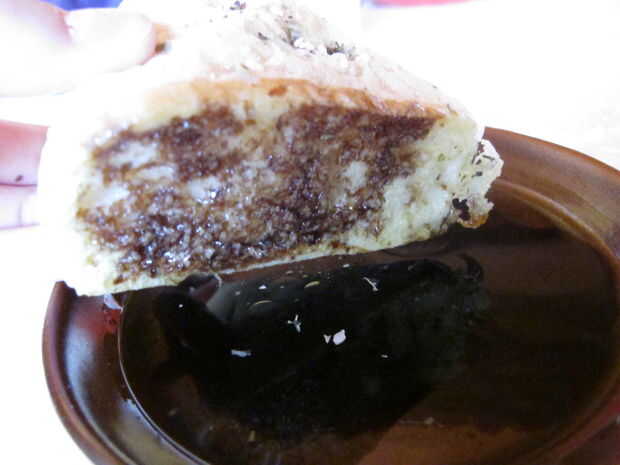 Mezclar8 cucharadas de vinagre balsámico y 6 cucharadas de aceite de oliva en un plato y le sumergen Focaccia en él. Yummm!