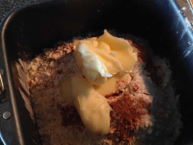 Pan casero siempre es super bueno. Simplemente delicioso y fresco.Paso 1: Ingredientes y método agua de 1 c2 cucharadas de mantequillaharina de 3 c3 cdas de azúcar1 1/2 cucharadita de sal1 cucharadita de canela2 1/2 cucharadita de levaduraAdemás 3/4