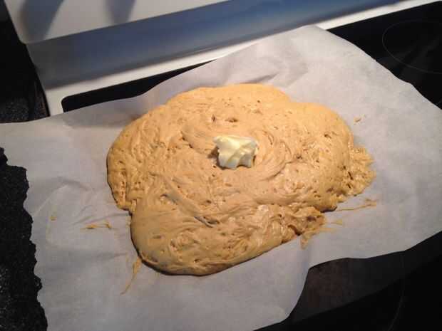 Cubrir la mano en una capa abundante de mantequilla y suavizar la masa.