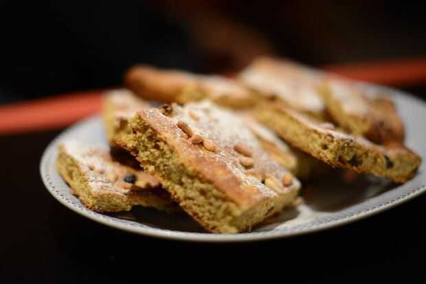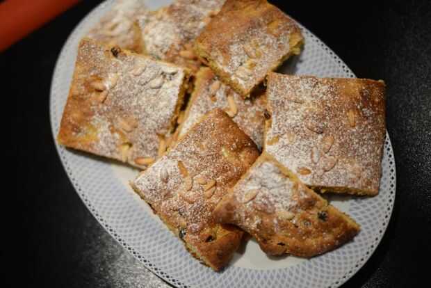 Después de este tiempo, suavemente presione la masa con los dedos en varios lugares y pincelar con el aceite. Cubrir con las semillas de pino, presionándolas ligeramente en la masa. Hornear a 180° C (350° F) durante 20/25 minutos (no se sabe tu horno mejor que usted, consulte con su habitual cocinar veces). Dejar enfriar y cubierta con glaseado de azúcar al gusto. Servir tibia o fría cortar en cuadrados.