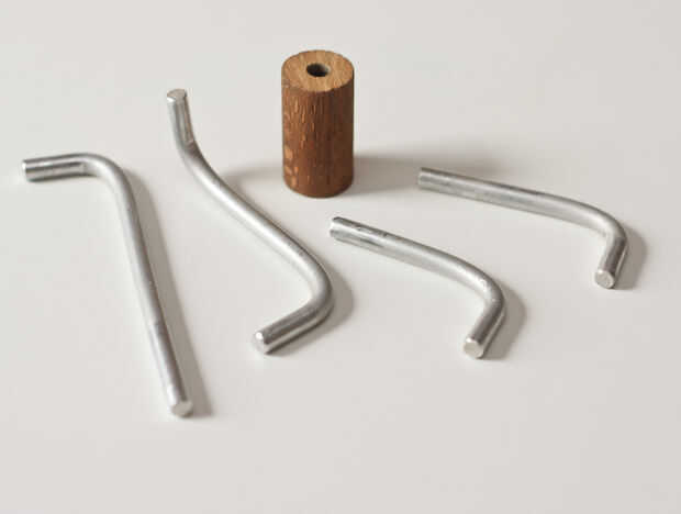 Estas barras de aluminio son de una vieja antena de TV, han de 6mm de diámetro y debe encajar duras en los agujeros. Cortar cuatro piezas de ellos y doblarlas en estas formas que ves en la foto. No hay ninguna necesidad de ser muy precisa, sólo asegúrate de tener longitud alrededor de la mitad de los cilindros de madera antes del doblez.