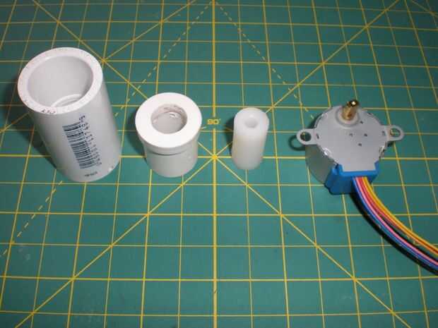 Una vez llegado mi paso a paso, tuve que acoplar los pasos al microscopio. Similar al montaje de la cámara, había logrado esto por un viaje a la isla de PVC en la ferretería. Usé la combinación de un acoplamiento de PVC de 1/2", 1/2" conexión (perforado para acomodar a espaciador) y un espaciador de Nylon 1 1/2". Usé un micrómetro para medir el diámetro de la perilla de enfoque y el eje del motor paso a paso; y luego pregunta en Home Depot hasta que encontré una combinación razonable. Luego perforados, orificios roscado e instalar tornillos para sostener todo junto. Usé un anillo de espuma para deslizar el 1/2" acoplamiento sobre el botón de enfoque para que no raspe encima de mi microscopio.