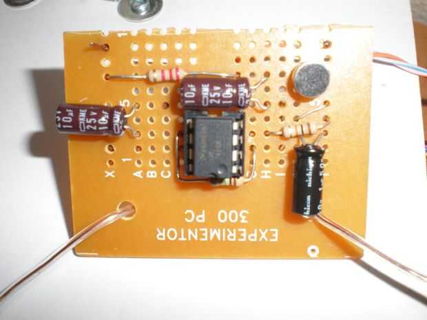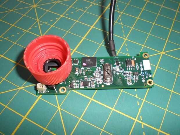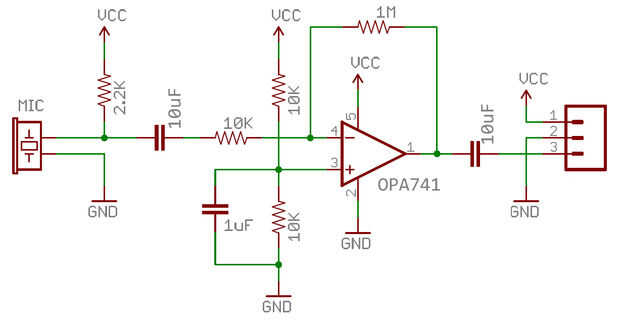 Tengo un micrófono de electret rescatado de una webcam Logitech que había reutilizar para la original cámara de microscopio (ver foto de arriba y la imagen del sistema completo en el último paso), pero encontró la resolución demasiado baja. Ya que no pude quitar el amplificador de micrófono de la placa de Logitech sin arruinarlo, tuve que construir mi propio. Utilicé el esquema anterior (editado de: https://www.sparkfun.com/products/9964) para crear un micrófono amplificado en su propia placa de circuito (algunas resistencias en la parte inferior en la foto superior), así pude colocarlo cerca del altavoz de la cámara para evitar el disparo indeseado.