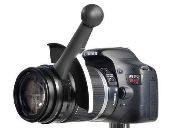 Para colocar la palanca de cambios, simplemente deslice sobre la lente, en el anillo de enfoque y apriete con el extremo de bola. El marcador de foco se conecta la lente con una banda elástica y ha sobre-moldeado pies de goma para sujetarlo.