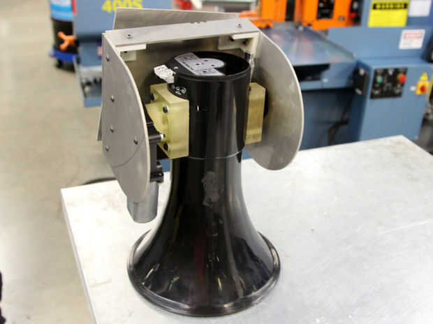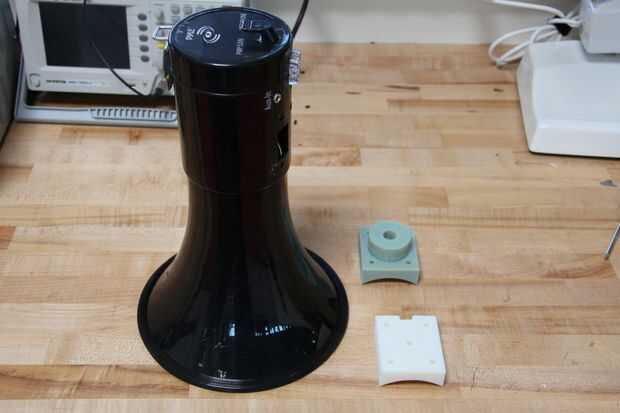 Inclinación parecía bastante fácil, sólo tuvimos que averiguar una forma de acoplar un motor al cuerpo del megáfono. Consideramos que mediante un sistema de engranajes y correas, pero en oder para mantener el diseño simple y minimizar el número de partes móviles que podrían romperse, decidimos colocar directamente el motor al megáfono con algunas piezas impresas en 3D personalizados.