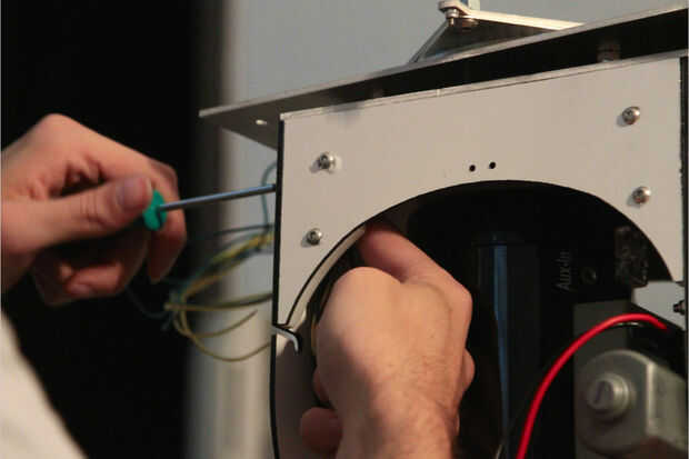 Entonces, 3 lados de la caja de inclinación se ponen juntos, dejando el megáfono, por lo que podemos alcanzar dentro de la caja para fijar el panel superior al mecanismo de la bandeja. Una vez que está todo junto, el megáfono y el último panel se jodan en su lugar.