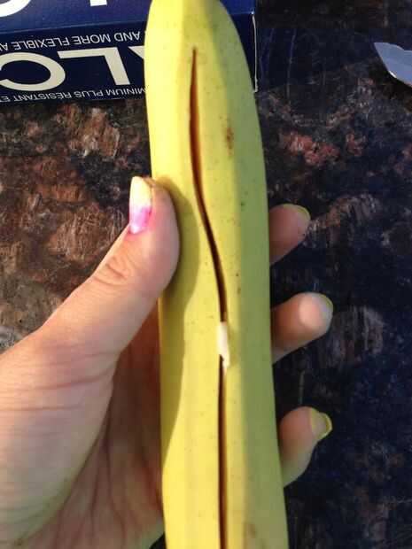 Que desea empezar su tratamiento cortando el plátano hacia abajo en el centro. Asegúrese de que usted no corta completamente al otro lado. Usted quiere cortar la cáscara de la banana y la banana real.
