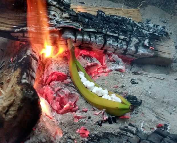 Este es un delicioso placer cuando acampar o simplemente tener una fogata afuera en su patio trasero! Con estos simples pasos poco tienes un delicioso tratamiento chocolate.Cosas que necesitará:Chips de chocolateMalvaviscosCanelaUn plátanoPapel de al