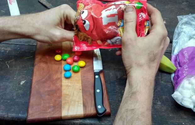 Va para el efecto de arco iris en el producto final opté por usar mantequilla de cacahuete M & Ms para el relleno. Cuando se cocina el instrucatble pre prueba plátanos que descubrí mientras que imparte un gran color de la banana la cáscara dulce mantuvo el chocolate derritiendo y bien pegajosa. Así que para este instructable colocó en sabrosura sobre estética.