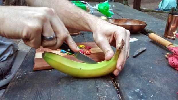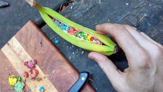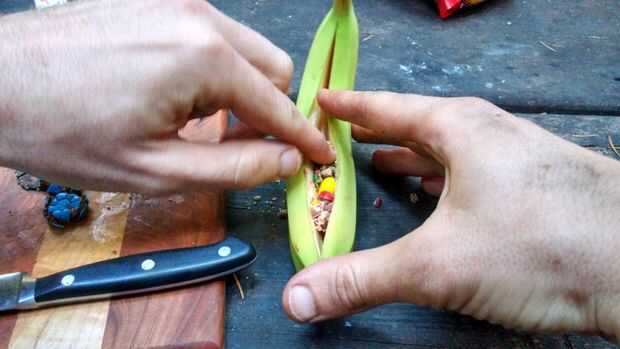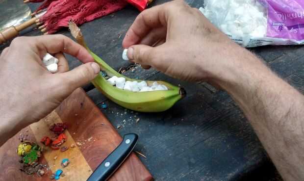 Ahora que tuve mi M & Ms rompió era hora de ponerse a trabajar en el plátano. Cuidadosamente en rodajas el plátano del tallo hasta la punta asegurándose de no cortar completamente a través de la banana. Luego empuja con cuidado en cualquiera de los extremos del plátano que abrí el plátano a revelar a dónde dirigiría todo el caramelo relleno. Ahora que tenía un vacío llena cuidadosamente con una capa de triturado M & Ms y luego una capa de mini malvaviscos. Ahora llegó el momento de jugar con fuego.