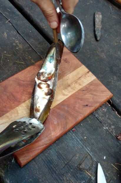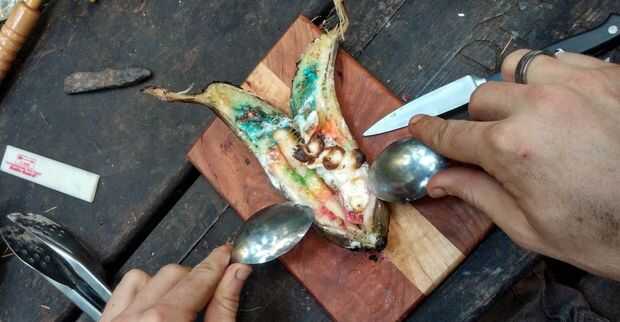 Ahora que fue cocinado el plátano me quité los carbones y usando dos cucharas abrió. Como he dicho antes después de mucho buscar alma fui con gusto estética. Como se puede ver la cáscara de caramelo todavía había impartido algunos de su color a la banana al obtener bien pegajosa. Este plátano era todavía caliente así que permita que se enfríe un poco y excavado en.