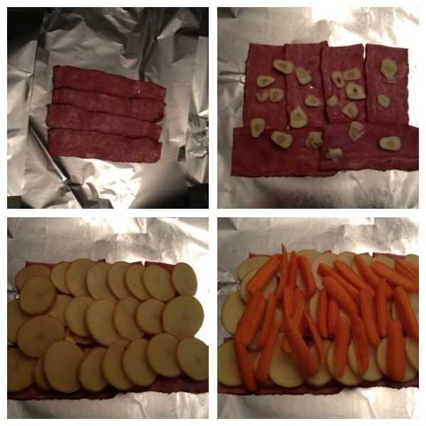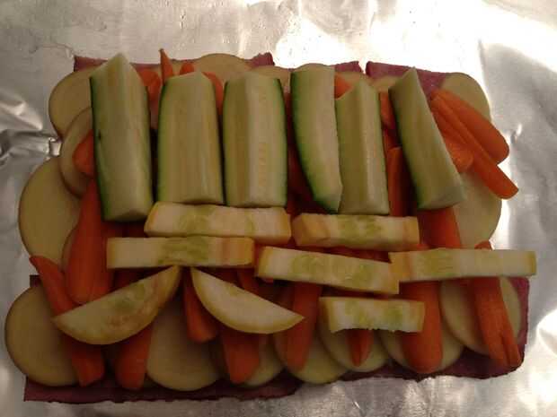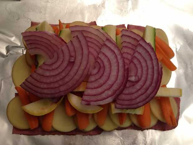 Encima de la carne, le puse ajos me gusta mucho el sabor. Entonces puse en 60 por ciento de mis papas. Una vez más, la patata se cocinará más lento que la mayoría de los otros vegetales, por lo que debe estar más cerca de la parte inferior o superior hasta sus más directamente en el calor. Como se puede ver en las fotos, puse la mayor parte de mis zanahorias encima de la papa, la mayoría de mis calabazas de verano y calabacín encima de eso y todos mis cebollas en último. Este es el medio de la cosa de la patata. Invertirá capa las mismas verduras encima de las cebollas, como que va ser darle vuelta en el fuego. En este punto también se puede poner una "capa" de especias en el centro-como activar lo de patata a la parrilla o en el fuego los aceites moverán las especias a lo largo de las verduras.