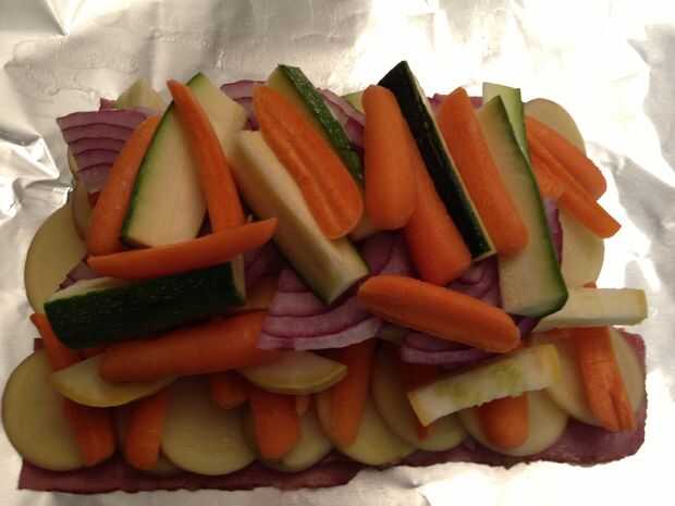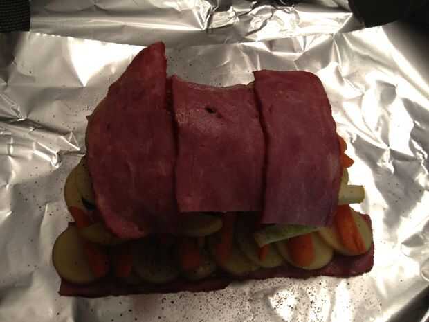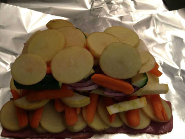 Ahora, como dije, seguí revertir Coloque las verduras en la parte superior hasta que puse mi carne y patatas en la parte superior.