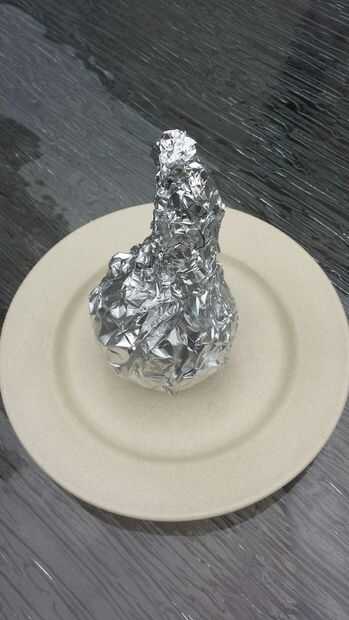 Envolver su pie en algún papel de aluminio con el lado brillante hacia dentro. He encontrado que es mejor hacer 3 capas para que el papel de aluminio no quemar o extraer si usted mueve (esto sucedió la primera vez atado esto cuando yo sólo una capa de USD). Espere hasta que el fuego ha pasado a carbones antes de poner en su pie. Encontré que la mejor manera de conseguir su pie en la el fuego era por perforar un agujero en el papel de aluminio en la parte superior con un palo tostado y luego pegarse una puntas del palillo en el agujero de la asación y guiar hacia el calentador. Engancharía en otra vez a moverse el pie como si había una mejor área para cocinar en las brasas, o si se estaba haciendo demasiado calor.