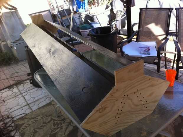 Luego imprimir la plantilla desde el archivo .c4d y colocar la hoja restante de madera contrachapada. Cortar dos de estas tapas, y ahora puede empezar la Asamblea. (si no tienes cinema4d, las dimensiones son fáciles de averiguar... los pedazos de 1 pie de madera contrachapada son a escala de la imagen y en 30deg y 60deg fuera de centro, con los ángulos laterales entre ellos en 45 º. La sección vertical es de 6" de alto)