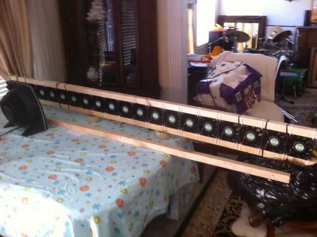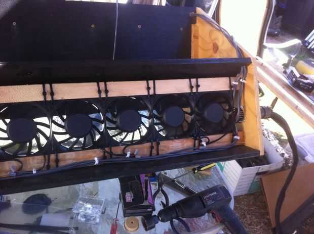 Más barato bajo CFM ventiladores: éstos se establecerán en una configuración de 2 x 20 ventilador. La forma más fácil que encontré conectarlos fue enrosque un perno entre 4 esquinas y pellizcarlos abajo a cada lado con una arandela guardabarros (según la primera foto)... entonces todos los cables de salida de los gases de escape del ventilador (lado de admisión) y zip empate a 1 x 2 en cada lado, dejando aproximadamente 1" de cada extremo. (serán la parte inferior central aficionados en la última foto... aviso que tenemos el ancho madera sabio)... puedes conectar todos los conectores molex de cadena o de la soldadura de todos estos juntos en este momento si desea.