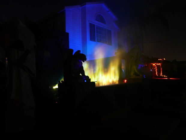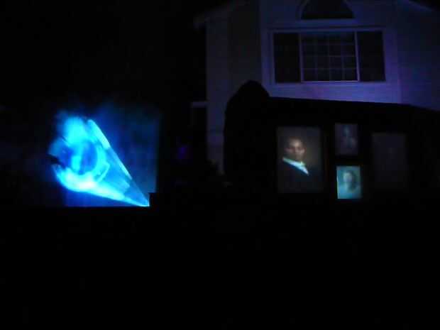 Nota: Para la noche de halloween utilicé un 3500 lumen proyector y máquina de humo de 1200w de dj del americano, y eran ambas más que suficientes. Se podía ver la imagen más de una cuadra de distancia. Video se localiza con resolume y la aplicación de iphone para control inalámbrico, aunque un reproductor de dvd podía perfectamente.