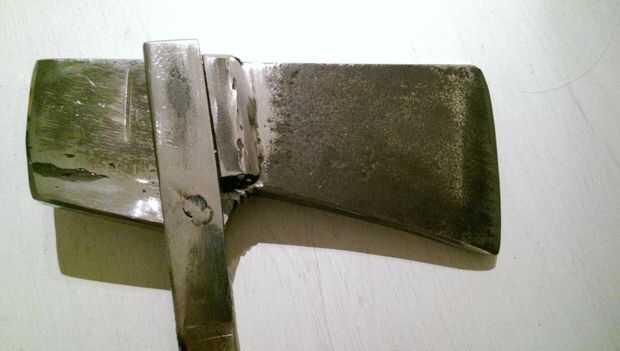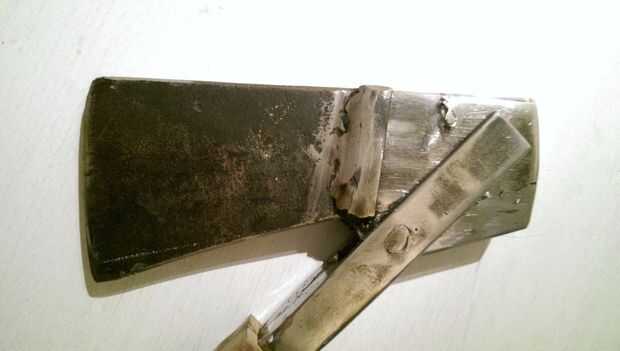 Cortadas dos pequeñas tiras de hierro de stock y soldarlas a la cabeza de hacha. Use el ángulo correcto.