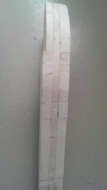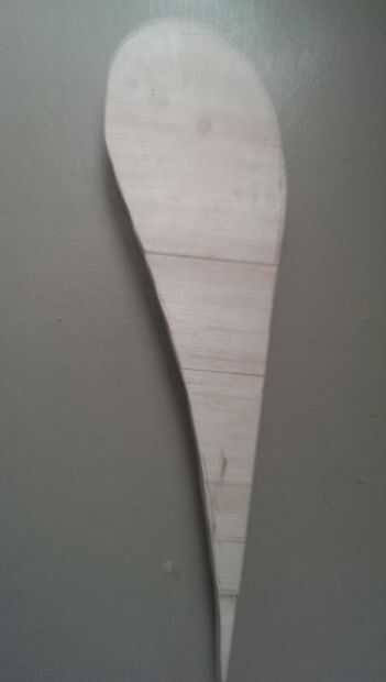 La capa interna consisten en 2 piezas de 10 x 1 x 100 cm balsa borde de madera articulados juntos. las dos piezas deben estar orientadas la veta de la madera sigue la longitud de la forma. comenzar la capa interna con el corte de un pedazo de balsa donde encaja la mayor parte de su plantilla de cartón. Luego cortar una hoja más pequeña que puede pegar en la pieza más grande por lo que la plantilla se adapta a sus tablas. Ahora cortar más o menos su forma de plantillas de la Junta de la balsa.