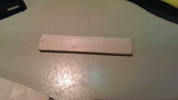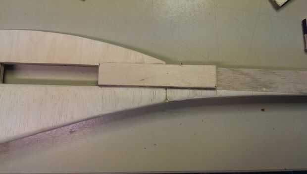 corte de las piezas de madera contrachapada 2 de 5 mm de 3 cm x 10 cm. estas dos piezas que se pega en el lugar donde el apego ala punto y cumplir con el listón. con uno de los bordes al ras con el agujero en el accesorio del ala del punto.
