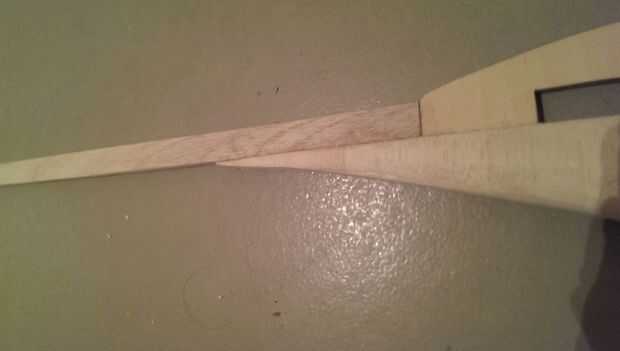 hacer su listón de balsa de 3 cm x 1 80 cm de largo. y usar un cortador de la caja para reducir el listón hacia el final. después de esto usted puede pegar el listón sobre el accesorio del ala y la nariz del punto (véase el cuadro).