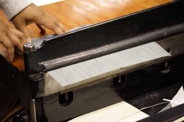 Utilizamos un corte de tablero, pero puede utilizar un cuchillo y una regla, si no tienes un corte de tablero. Algunos "guillotinas" puede funcionar, pero otros tienden a rasgar los bordes de la tela o fractura lejos del soporte de papel.