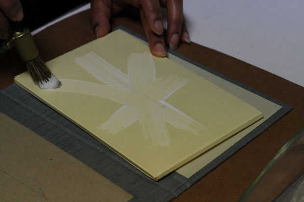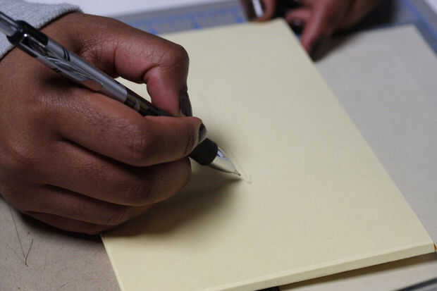 Marcar cuatro-aleta con una flecha en la parte posterior (tapa trasera) para indicar la parte superior (cabeza), asegurándose que la lengüeta y la ranura se enfrentan en la dirección deseada.