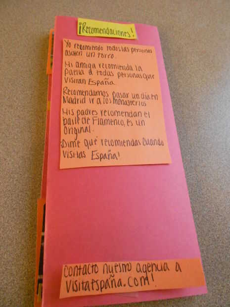 Un punto de la guía será designado para que los estudiantes a crear recomendaciones para alguien preparándose para viajar al país de destino. Las recomendaciones se hará en el tiempo presente y debe incluir cada tema (me, te, le, nos, se).