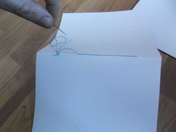 Con los orificios perforados, medir una longitud de hilo 4 veces más largo que la longitud de la columna vertebral. Con este hilo de la cantidad usted debe entonces doble pase el necesario (para la fuerza agregada). Estoy usando hilo azul aquí porque eso es lo que tenía disponible. Hilo blanco hubiera sido preferible.