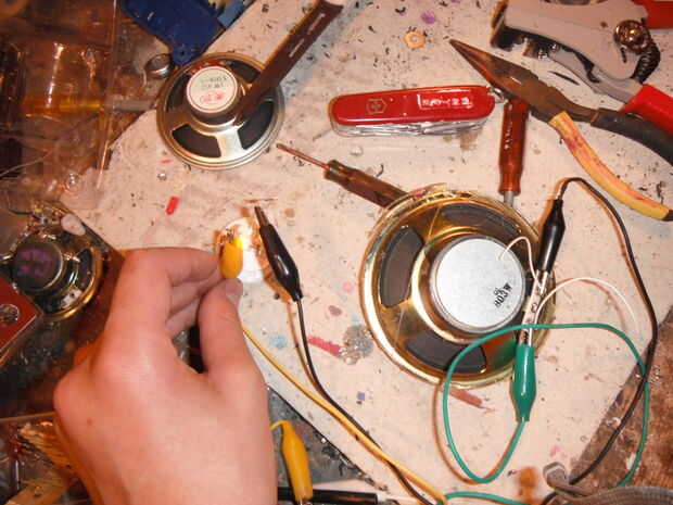 Durante la resolución de problemas, noté que sólo podía oír claramente el sonido si mi dedo era tender un puente sobre dos contactos de salida, así que añadí un potenciómetro en cerca de completo resistencia entre los contactos.