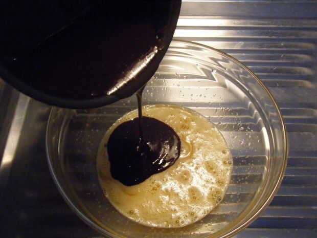 Mientras tanto, batir huevos y azúcar en un bol. A eso añadir la mezcla de mantequilla de chocolate y bata.