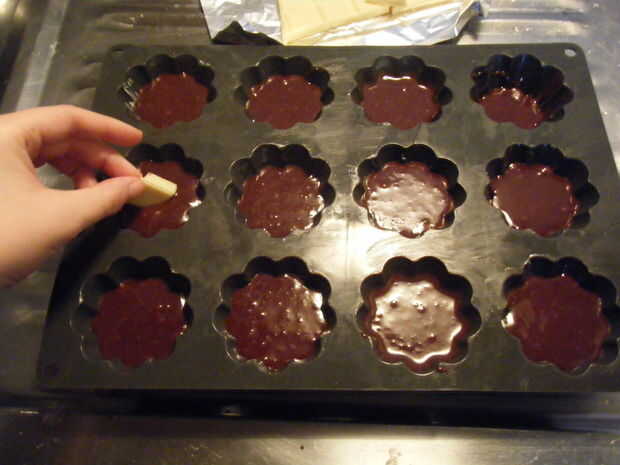 Poner un cuadrado de chocolate blanco en el centro de cada molde.