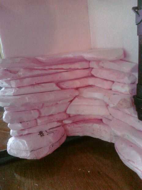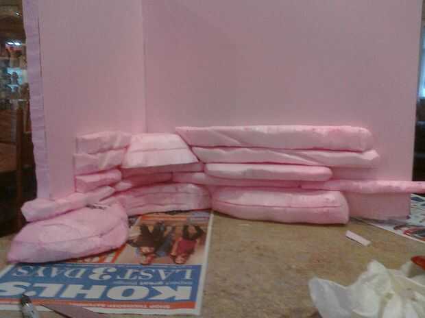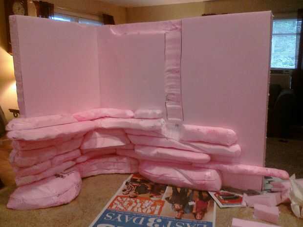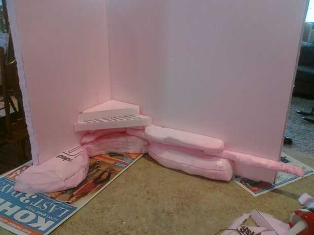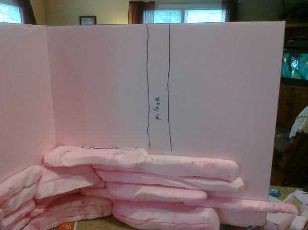 Seguir cortar y colocar piezas en el patrón deseado que desee.  Cortar las piezas y prueba los había equipado antes de pegar a la pieza posterior.  He pegado dos piezas de espuma con silicona y los clavos de mi fila inferior y permite que se sequen.  Asegúrese de quitar las uñas después de que seque.  Después de que en seco, había tallado les en la forma deseada.  Utilice el cardado o el cuchillo de la maquinilla de afeitar para darles un aspecto rugoso.  Use su imaginación!