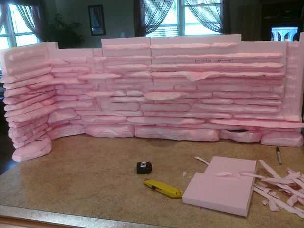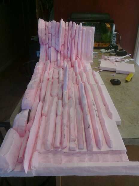 Tuve que mina cortada por la mitad para entrar en el acuario.  Traté de superponer piezas para que la costura no mostraría pero he encontrado esto para ser demasiado restrictivo cuando fui a la prueba cabe y no iban a ir juntos.  Voy a tener que rellenar la grieta más tarde tras su en el acuario.  Traté de mantener todas las "rocas" integradas por trazar sobre la mesa mientras el otro lado...