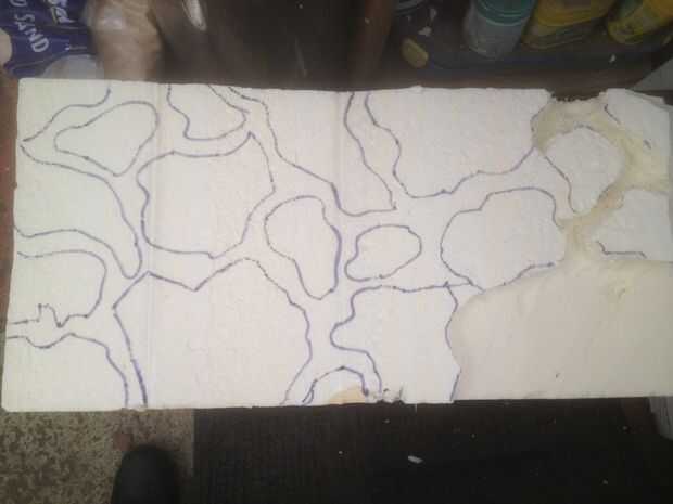 1) tome una vez equipada, Junta fuera del tanque y en pluma/lápiz (depende cómo seguro estás de tu primer diseño) dibujar sobre la cara externa de la espuma de la marca canales, paredes etc. tratando de mantener el diseño inicial relativamente simple como siempre puede agregar más detalles más adelante.
