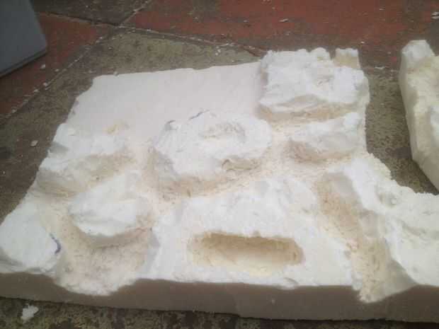 2) una vez completamente feliz con el diseño general comenzar creando la espuma. Como se puede ver en las fotos las principales zonas se mantuvieron como rocas y todas las áreas intermedias fueron las brechas de valles. Mientras se talla hacia fuera su diseño puede agregar textura de detalle adicional al fondo. Nuevamente esto depende de su diseño y el estilo que buscas como pizarra tendría caras planas lisas mientras que un efecto coral sería muy grumosa y textura. Como siempre esto se remonta a su investigación inicial y planificación, expresando su importancia antes de comenzar cualquier cosa especialmente si usted está comprando los materiales.