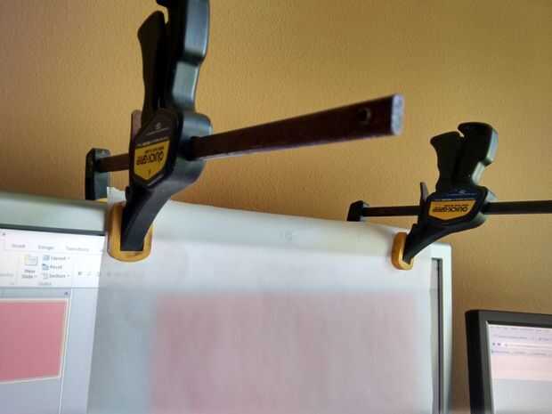 Utilizando un par de pinzas de agarre rápido, suspender el pergamino a través de la pantalla del monitor. Colocarlo más cerca posible de la pantalla, tocando si es posible. PRECAUCIÓN! ¡ PRECAUCIÓN! ¡ PRECAUCIÓN! No coloque las abrazaderas directamente en la pantalla. Sujeción de la pantalla sí mismo probablemente se romperá y será muy triste. No sea triste. Sólo Coloque las abrazaderas a lo largo del borde enmarcado del monitor y si no estás seguro, entonces por favor a parar aquí.