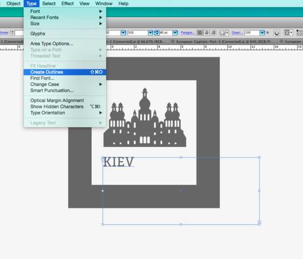 Convertí mi texto a contornos yendo a tipo > convertir en contornos. Entonces tamaño mi tipo por lo que tiene el mismo ancho que la silueta del edificio. Una vez más, mantenga pulsado shift mientras transformas el texto para no sesgarlo. Por equilibrio, solía Roma para equilibrar a la derecha. Usé a Berlín en el centro porque tiene 6 Letras vs 4. Aquí está mi diseño final con que voy a estar trabajando.