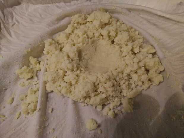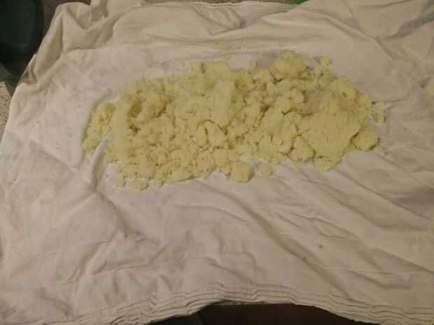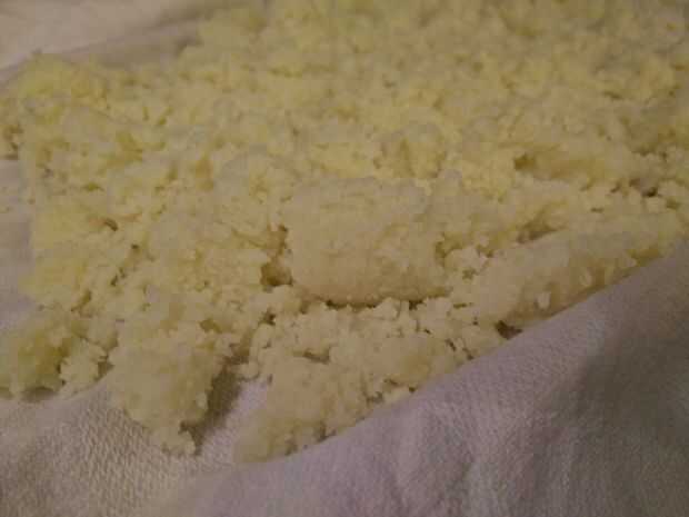 Ponen la mezcla hacia fuera sobre una toalla limpia. Deja que se enfríe al tacto y exprimir toda el agua hacia fuera. La secadora es, el crujiente será el fondo de la pizza. Buscar la mezcla grumosa y húmeda, no goteando húmedo.