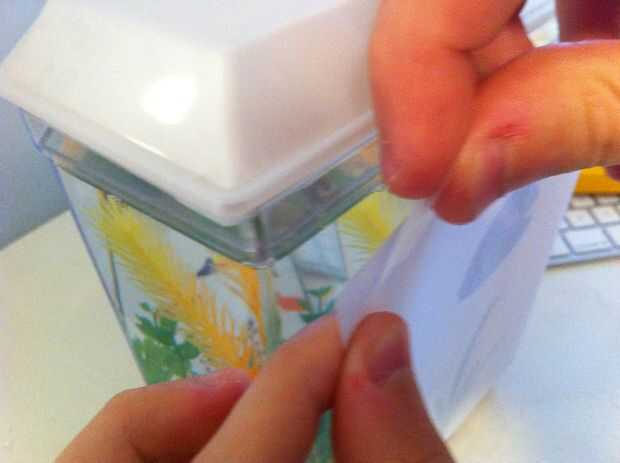 Ahora que tienes una escena de pesca compuesta por es momento de ponerla en el tanque! Coge dos trozos de cinta y pegarlos en algún lugar útil (como el brazo), donde se puede agarrar con una mano. Toma tu hoja de papel (u hojas grabadas juntos si usted tiene un tanque grande) y acercarse lentamente a la pecera. No queremos asustar a los peces cuando ponemos esto.