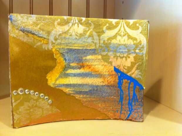 En esta tarjeta capas de papel pintado, papel de tejido y acuarelas. También he añadido mini-diamantes de imitación (con pegamento) que pueden ser agradables.