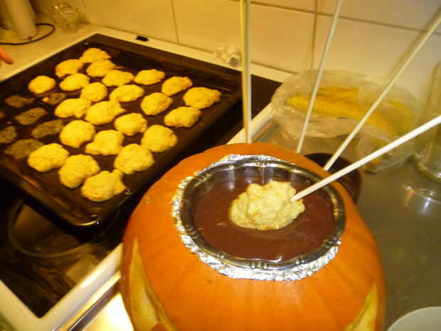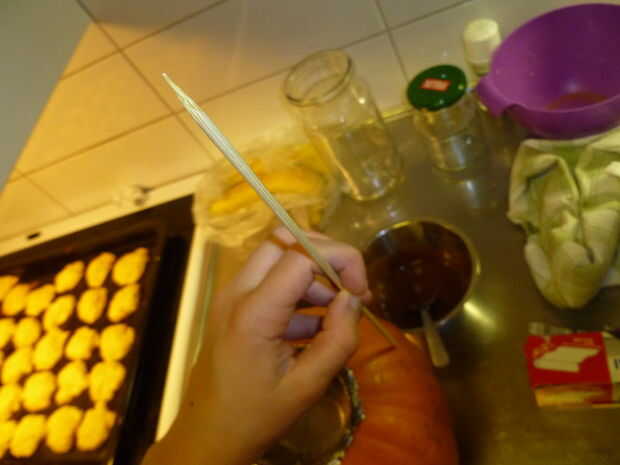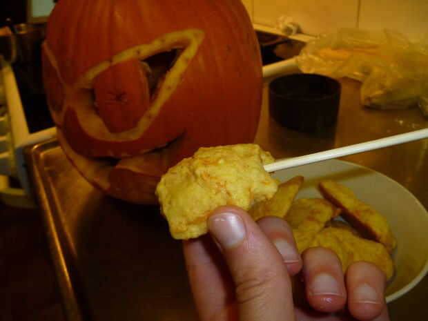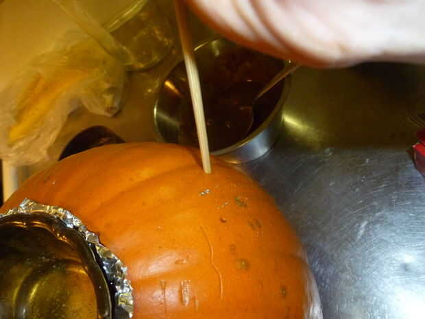 Utilizando una parrilla palillo hacer agujeros en la parte trasera de la calabaza donde se pegará en palillos de parrilla que se utilizará como palillos fondue.