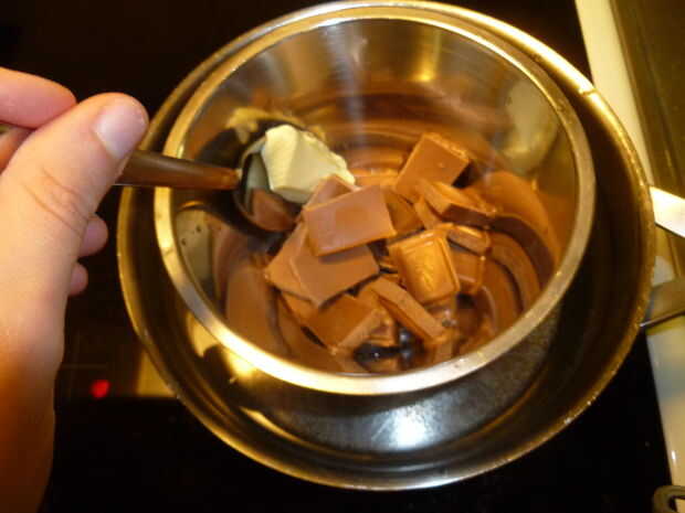 Puede comprar salsa de chocolate o derretir una barra de chocolate usted mismo. Fot este último que necesita para calentar agua en una cacerola y en otro poner el chocolate y algunos de mantequilla para que no se queme al calentarse. Probablemente usted necesitará añadir leche para evitar chocolate agarrado.