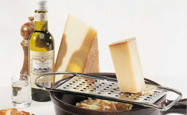 Preparar el gruyere por lo de rejilla. Para preparar el vacherin, cortar en trozos, aproximadamente 1/4" de ancho. Separar los dos quesos.