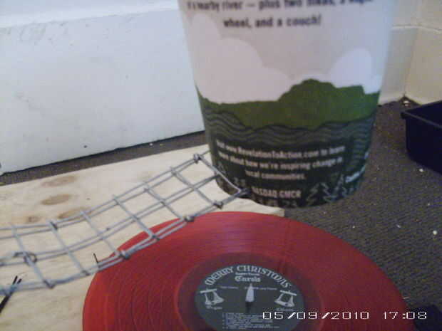 Ahora para el altavoz. Tomar la chincheta y hágale un agujero a través del centro de la parte inferior de la taza. Ahora tomar el rumbo e inserte en este agujero, esta vez desde el interior de la Copa. Finalmente Coloque el material para el brazo hasta el borde de la Copa.