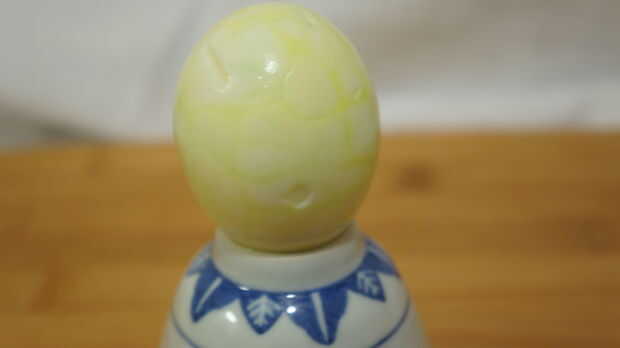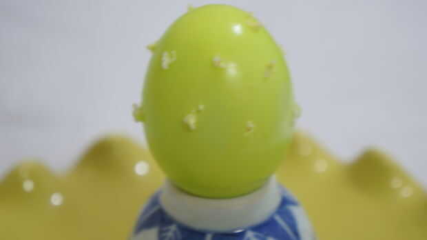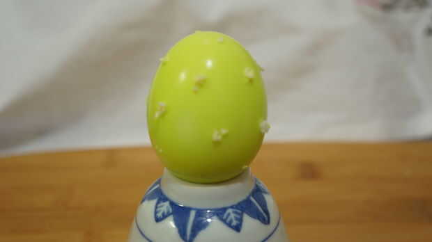 Establecer uno de los huevos lo menos atractivos en una tapa o plato como yo tiene que estabilizar el huevo mientras que taladra los agujeros.