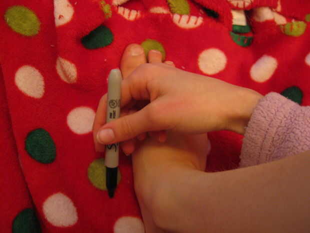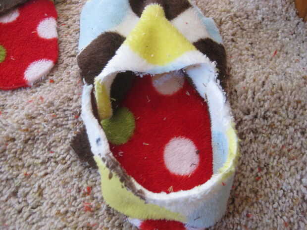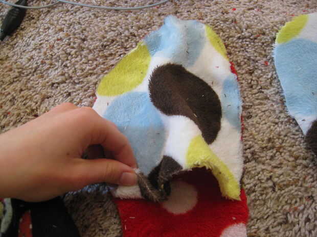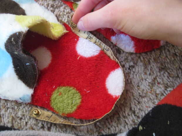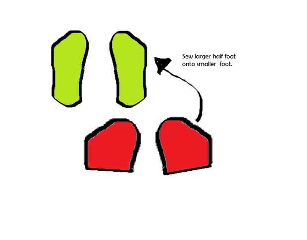 Coloque el pie en la tela de desecho. Trace una línea alrededor de su pie, agregando una pulgada extra, más o menos al contorno. Este corte, Voltear horizontalmente y rastro otra vez en el retazo. Son las plantas de su footies. Proceder a poner un corte suela sobre la tela y traza alrededor de él, agregando una pulgada al contorno (como se muestra en la segunda foto). Este recorte. Voltear horizontalmente esta mayor "sole" y traza otra vez. Para ambos de estos soles "más grandes", cortarlas por la mitad horizontalmente, por lo que se asemejan a sólo la parte superior de un pie. Línea de los bordes del pie medio más grande con los bordes de los pies más pequeños. Debe existir cierta holgura en el centro. Prender estas juntos y coser. Medir el contorno de la parte del pie que se ha cosido (como se muestra en el cuadro quinto). Hacer dos rectángulos que son la longitud que mide sólo por cerca de 3 pulgadas. Prender estas de pie, a las plantas de los pies que no se cosen sin embargo (como se muestra en el cuadro VII). Coser a la suela. No coser los pies revés porque la tela suave hace que sea difícil ver donde están las líneas de costura, y pensé que parecía fino cosido fuera de derecha. Finalmente, corte una hendidura en forma de v en la parte superior "el más grande medio pie", como se muestra en el cuadro VIII.